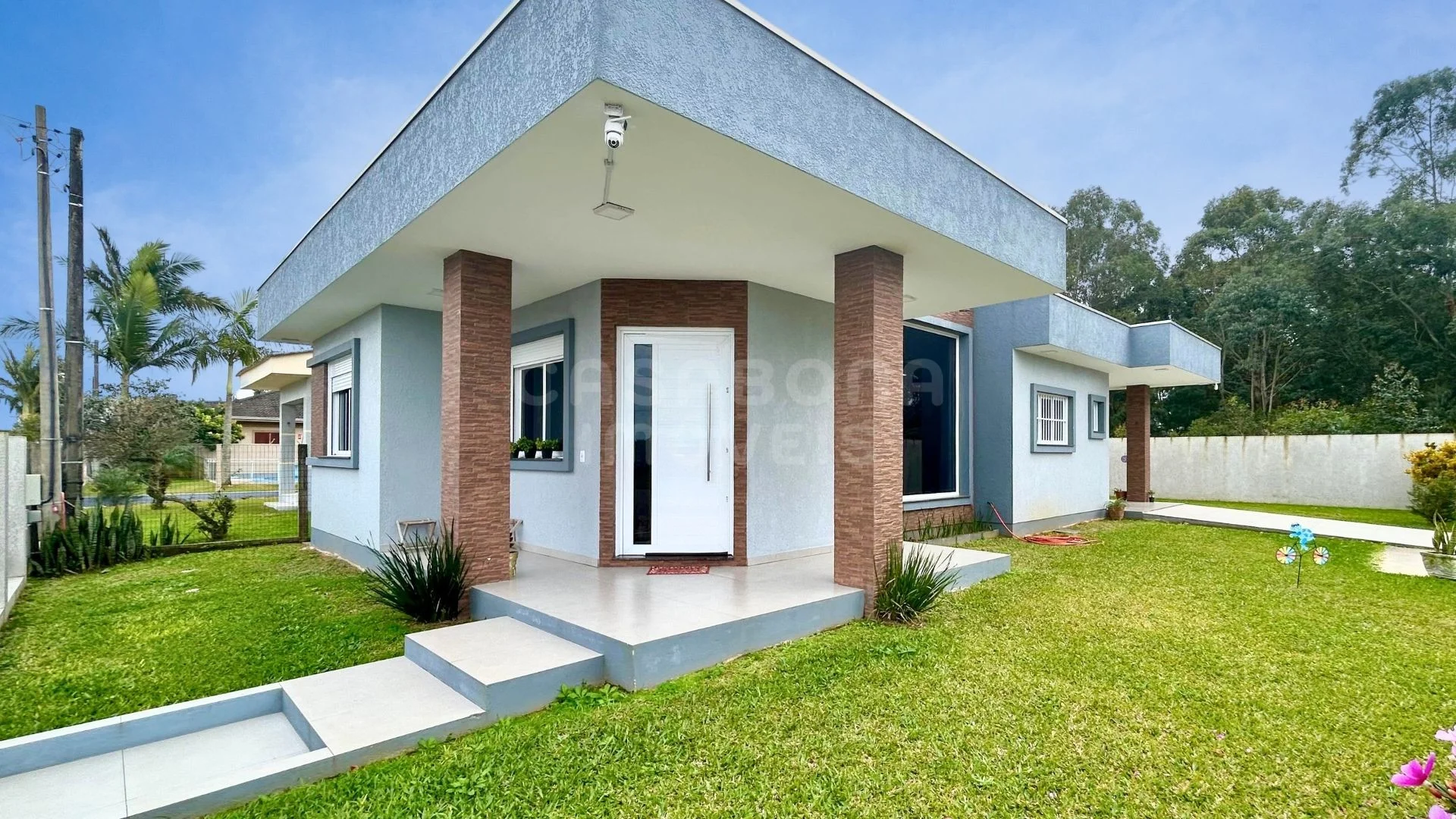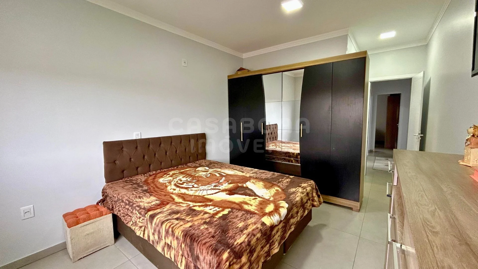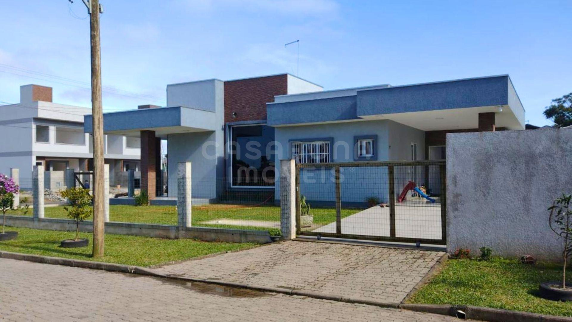 A casa conta com ambientes amplos e bem planejados: sala de estar e jantar integradas, cozinha com espaço gourmet, 3 dormitórios (conforme estrutura), área de serviço, banheiro social, garagem e depósito. O acabamento é de alto padrão, com piso porcelanato, esquadrias em alumínio, laje de concreto e excelente iluminação natural com posição solar Sul/Leste.