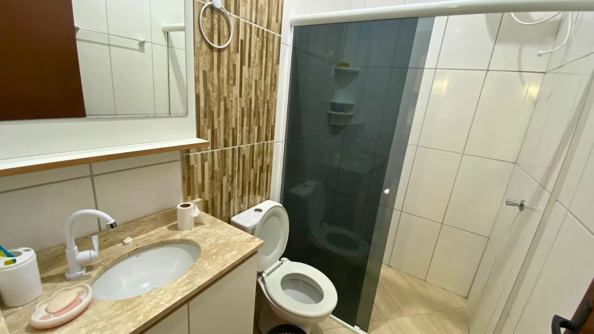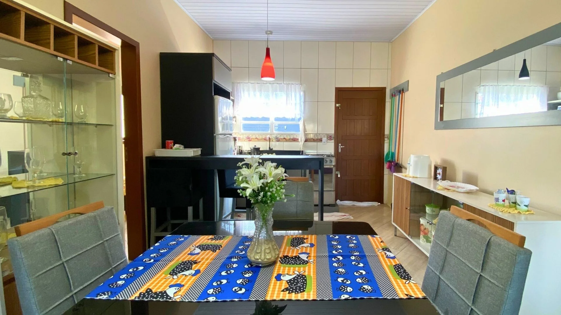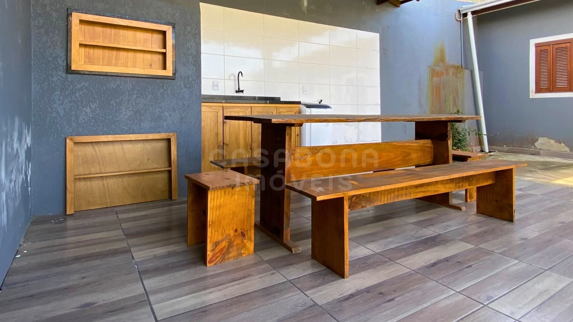 Nos fundos, o destaque fica por conta da área gourmet coberta com churrasqueira, bancada e mesa de madeira, perfeita para confraternizações e churrascos com amigos. A garagem coberta garante segurança e praticidade no dia a dia.