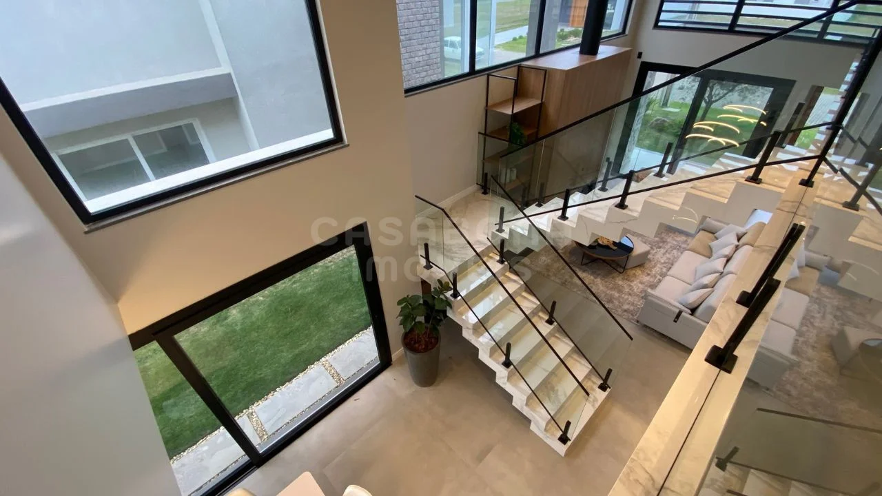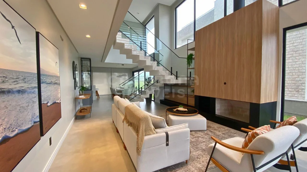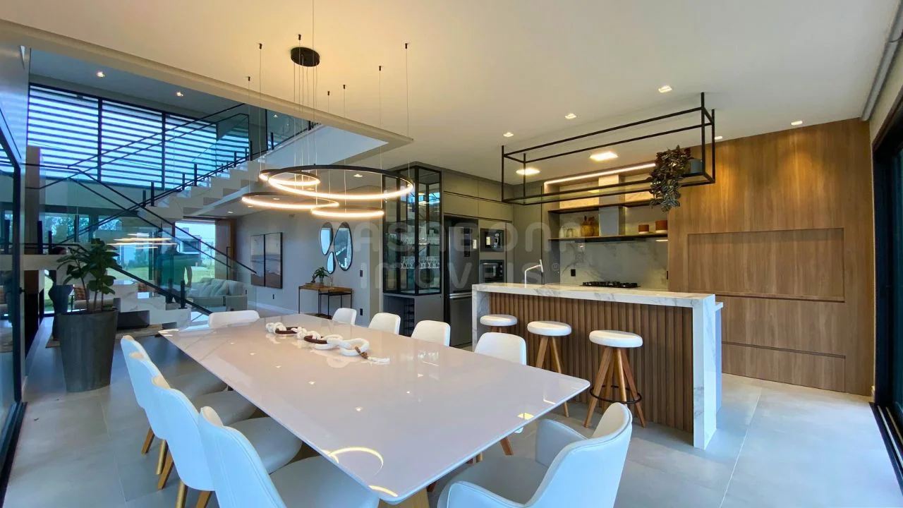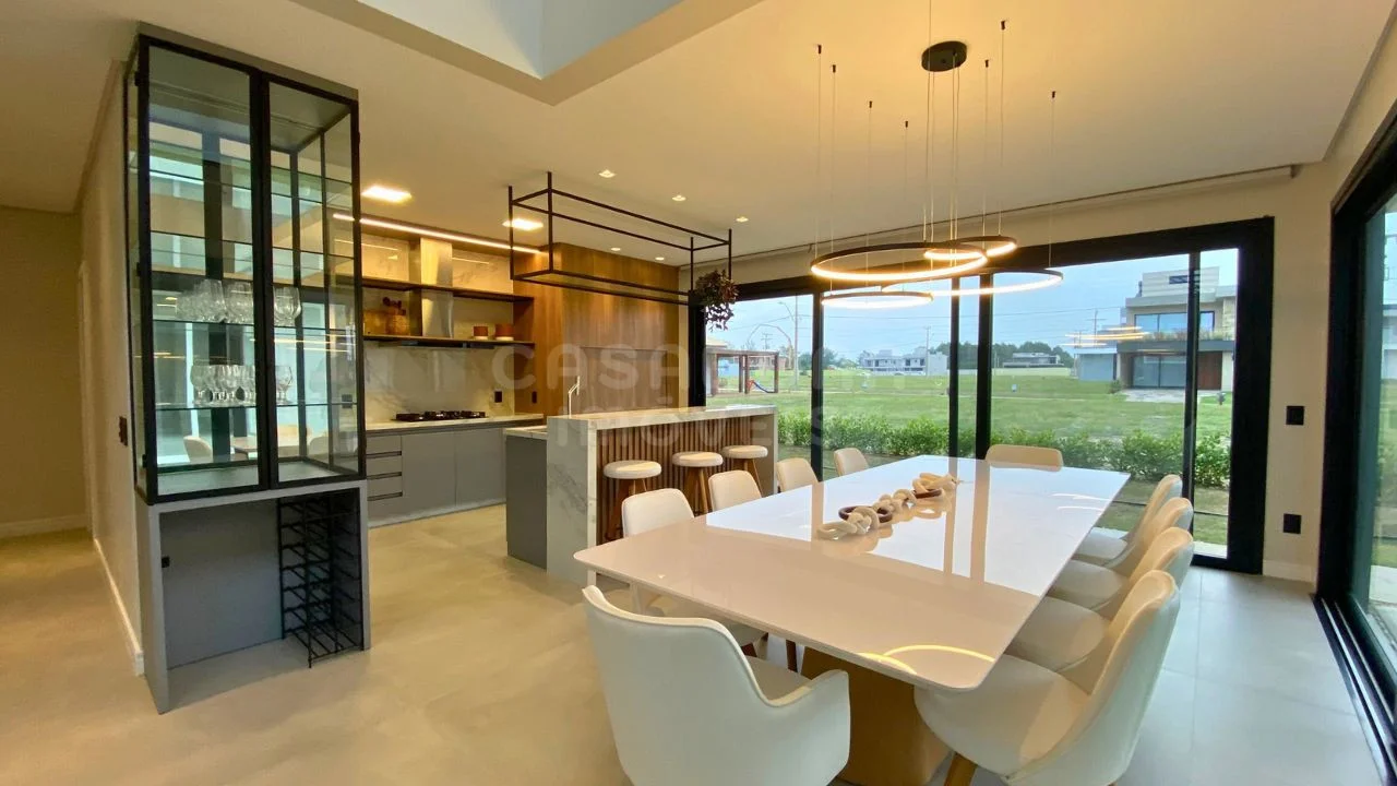 A área social impressiona com sala de estar com pé direito duplo, integrada à sala de jantar e à cozinha, criando um espaço amplo, iluminado e acolhedor. A casa conta com esperas para energia solar e aquecimento da piscina, além de detalhes pensados para o seu conforto como persianas automatizadas, churrasqueira, lavabo, área de serviço, depósito e sacada.