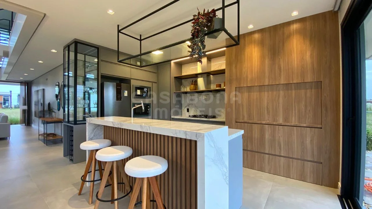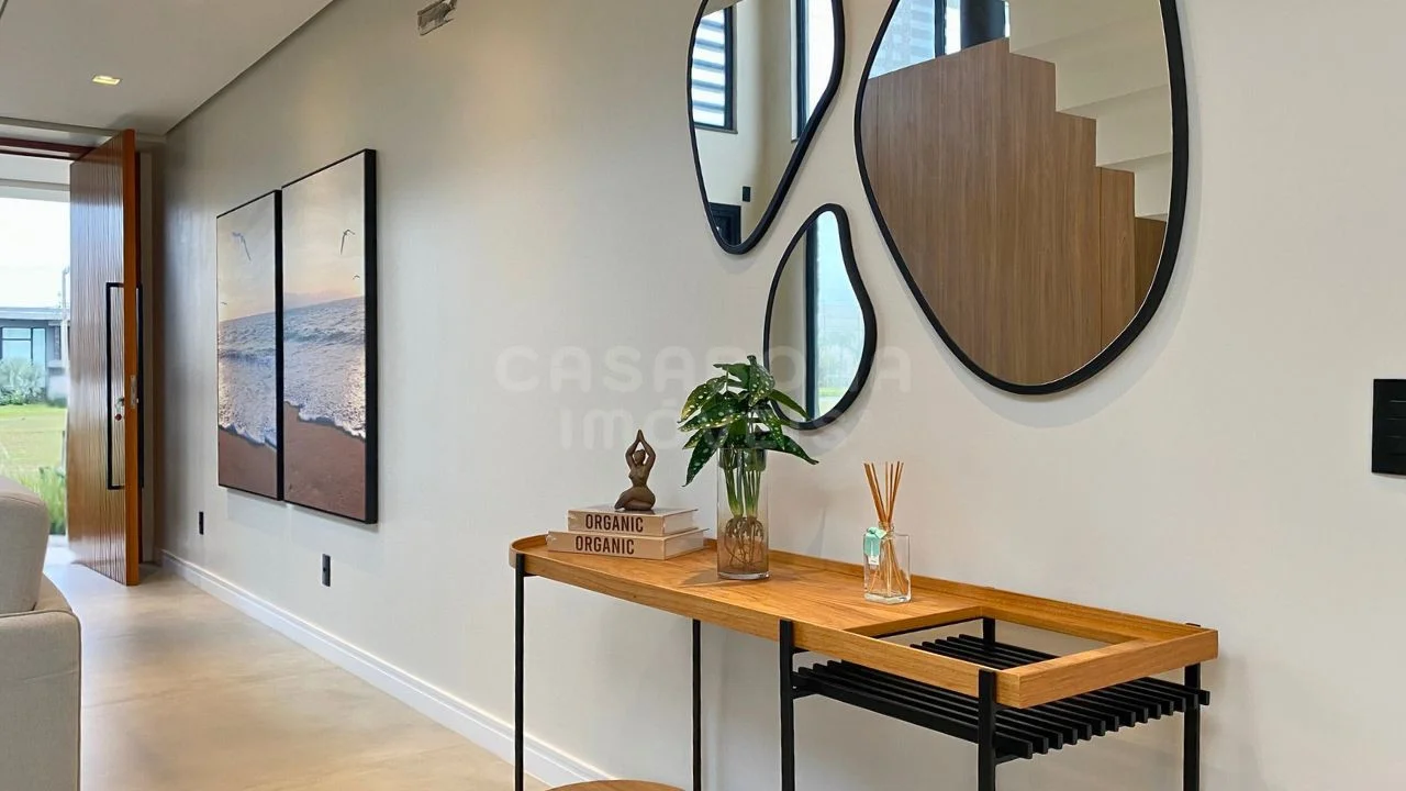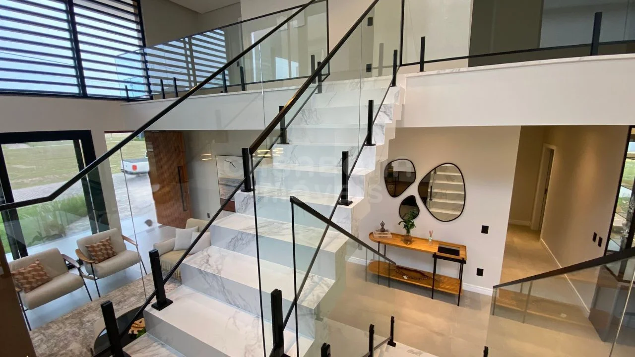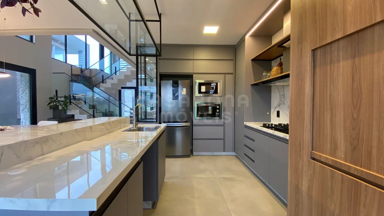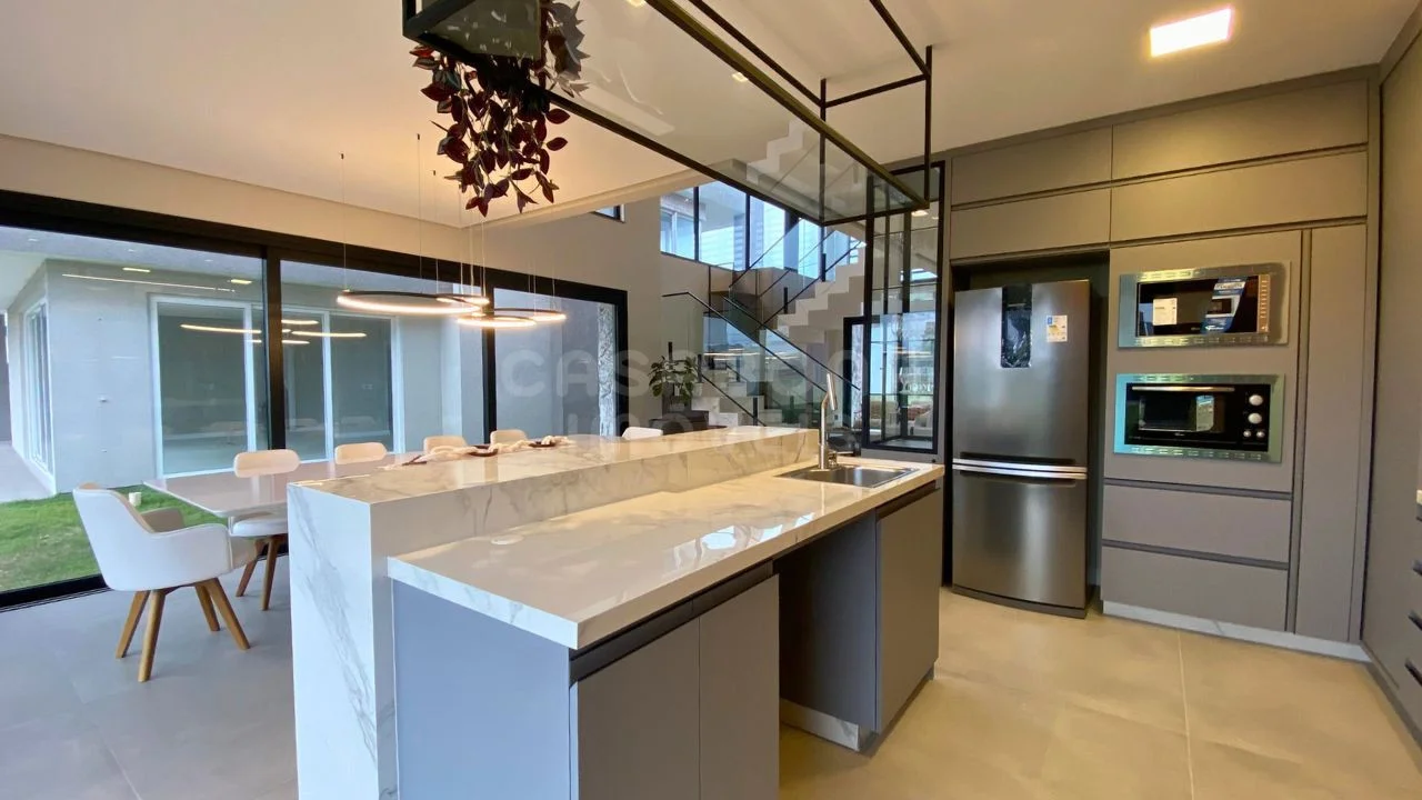 A área social impressiona com sala de estar com pé direito duplo, integrada à sala de jantar e à cozinha, criando um espaço amplo, iluminado e acolhedor. A casa conta com esperas para energia solar e aquecimento da piscina, além de detalhes pensados para o seu conforto como persianas automatizadas, churrasqueira, lavabo, área de serviço, depósito e sacada.